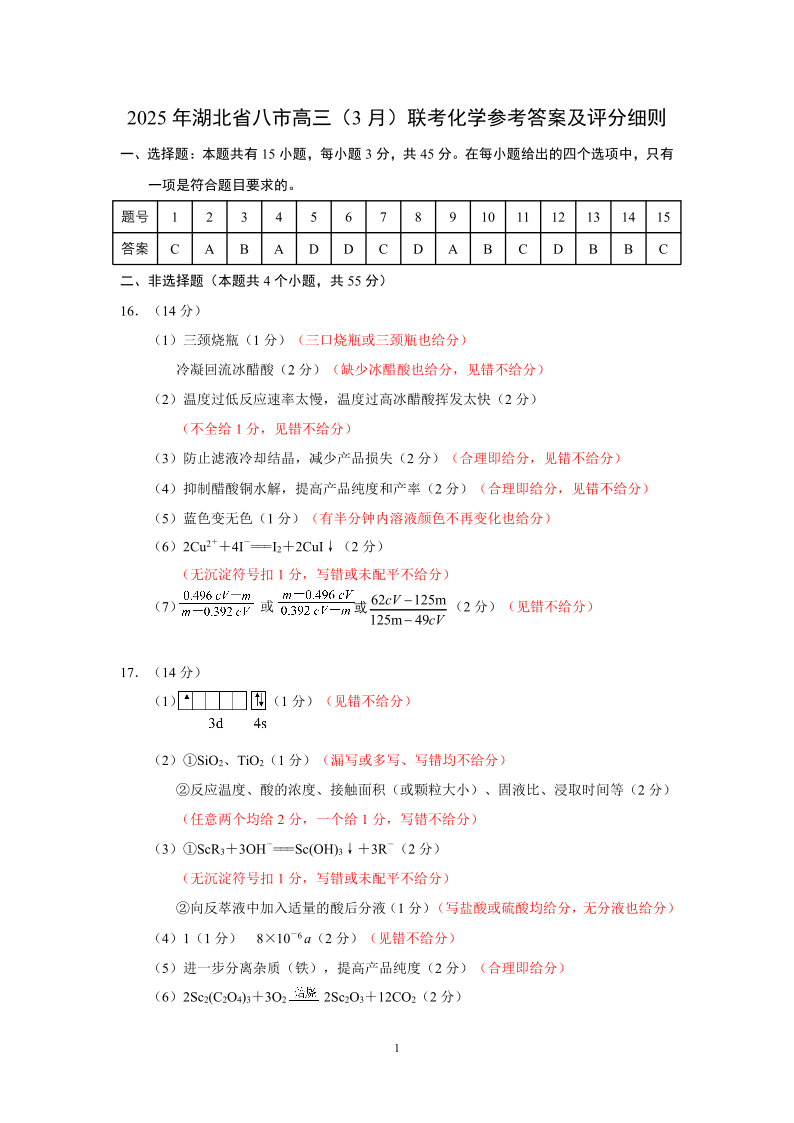 湖北省八市2024-2025学年下学期3月高三联考化学答案
