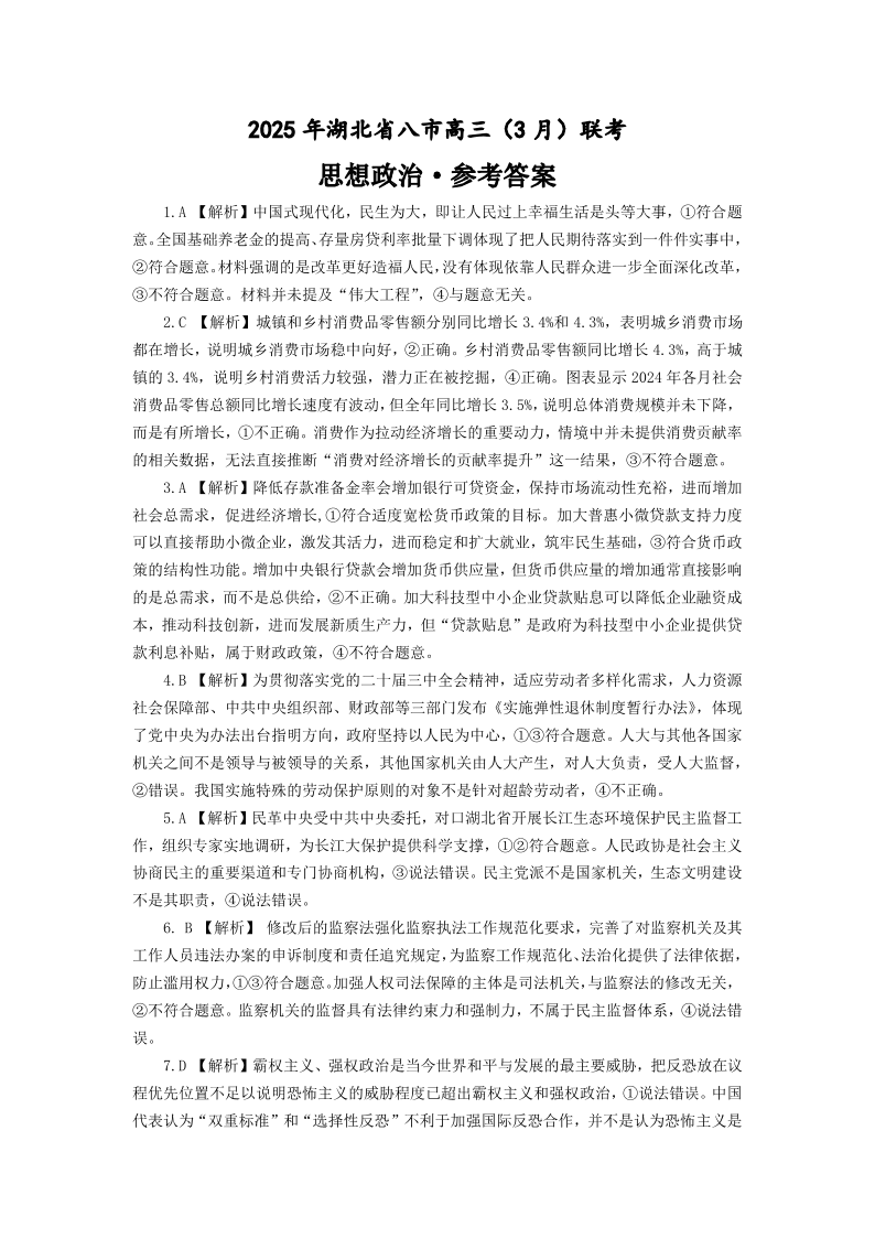 湖北省八市2024-2025学年下学期3月高三联考政治答案
