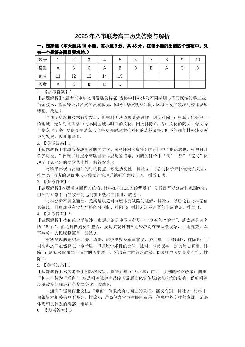 湖北省八市2024-2025学年下学期3月高三联考历史答案