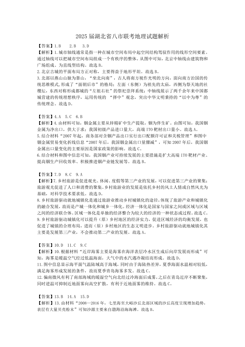 湖北省八市2024-2025学年下学期3月高三联考地理解析