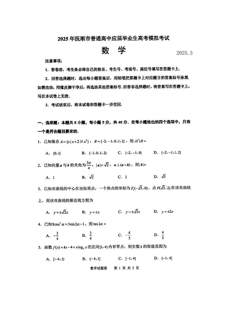 辽宁省抚顺市2024-2025学年下学期3月高三模拟考试数学+答案