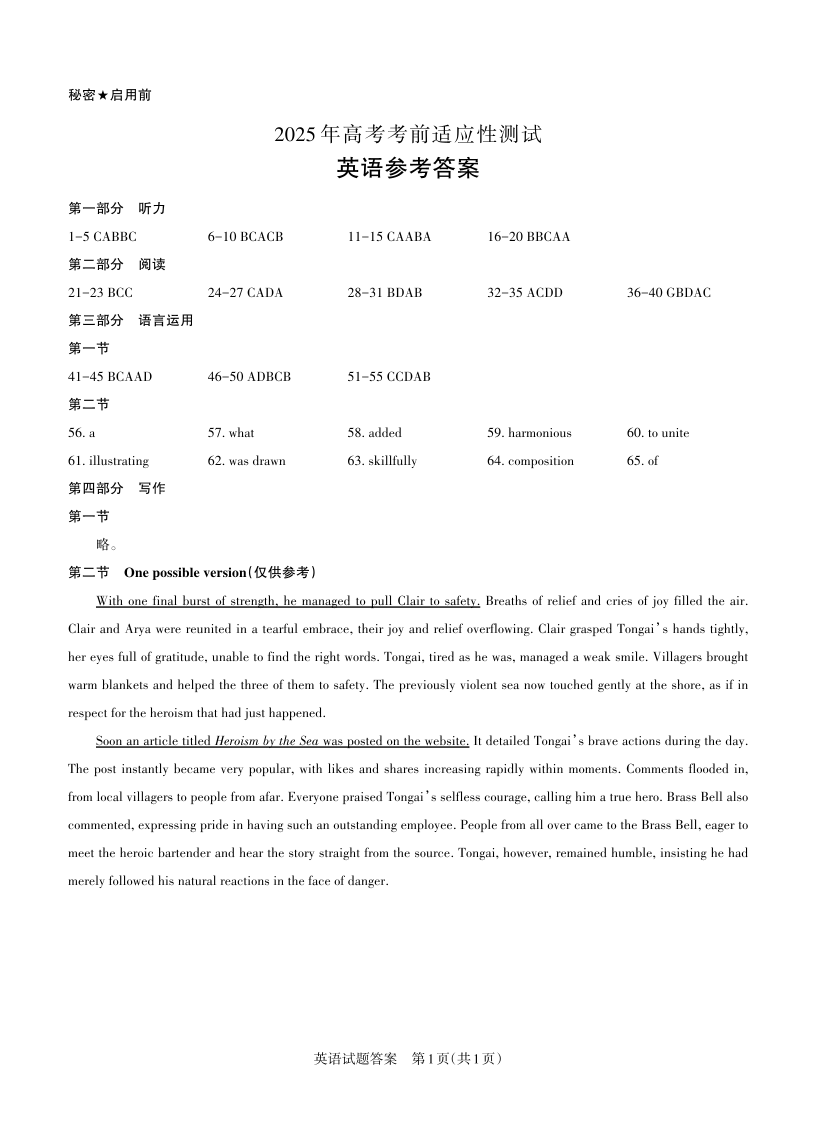 山西省区域高中2024-2025学年下学期3月高三适应性测试英语答案