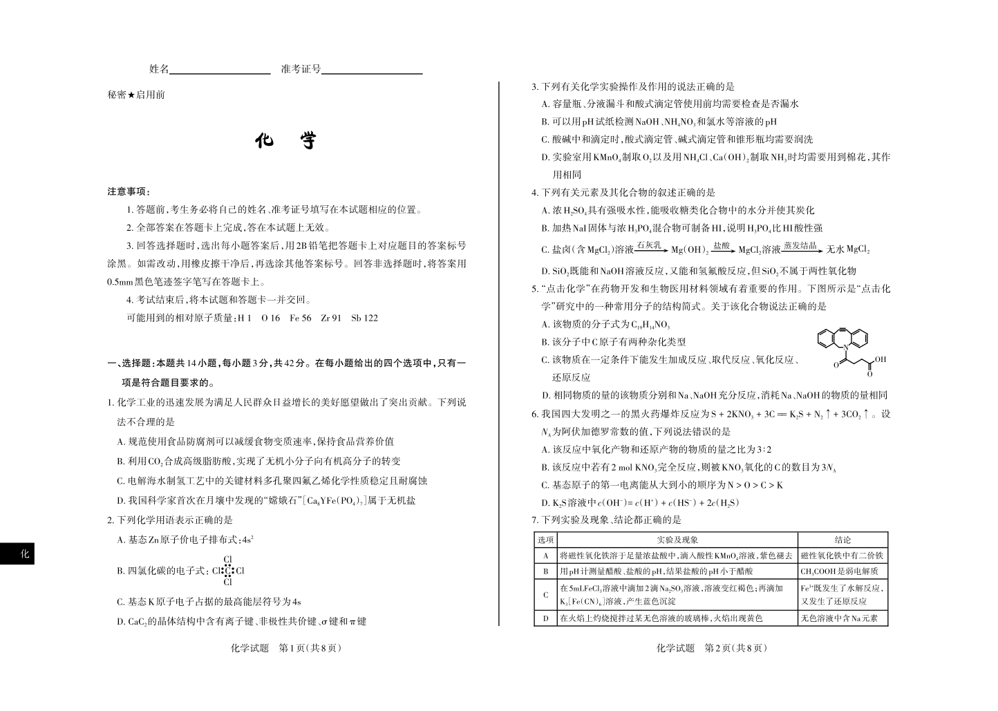 山西省区域高中2024-2025学年下学期3月高三适应性测试化学