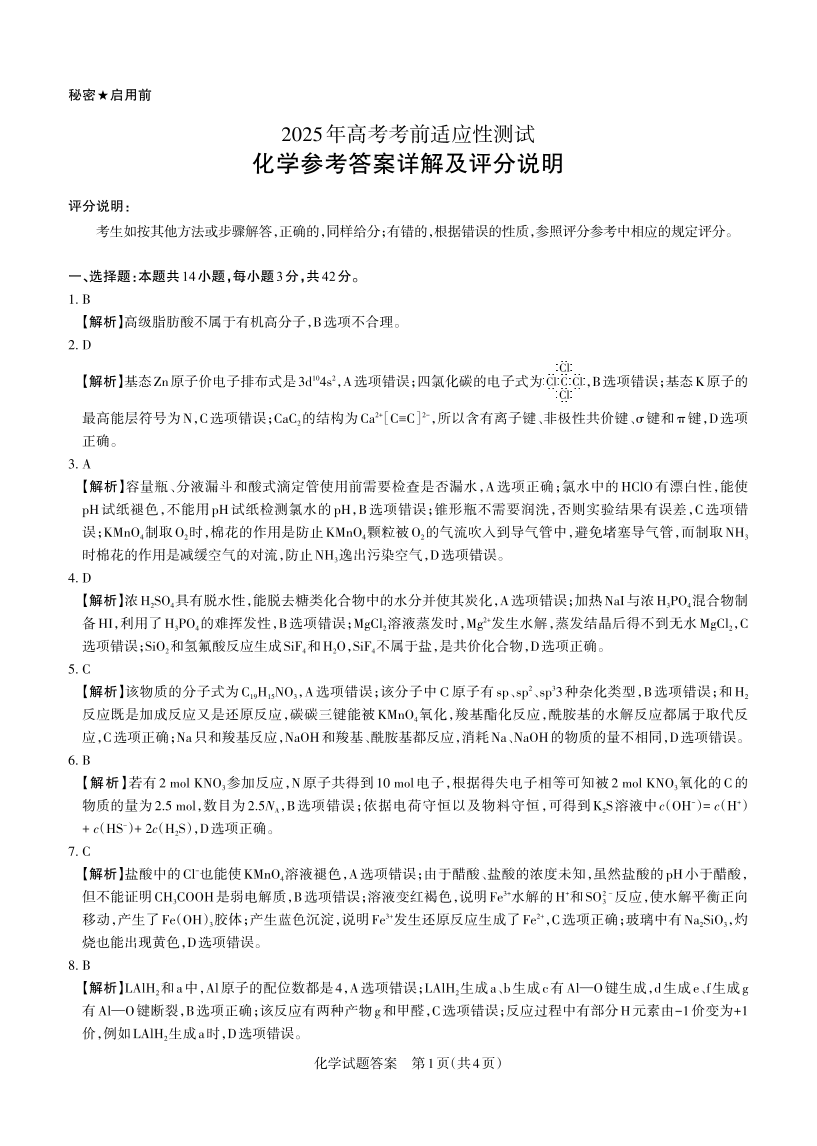 山西省区域高中2024-2025学年下学期3月高三适应性测试化学答案