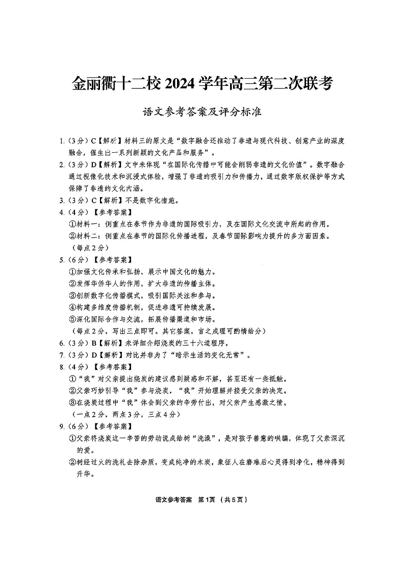 浙江省金丽衢十二校2024-2025学年下学期3月高三联考语文答案