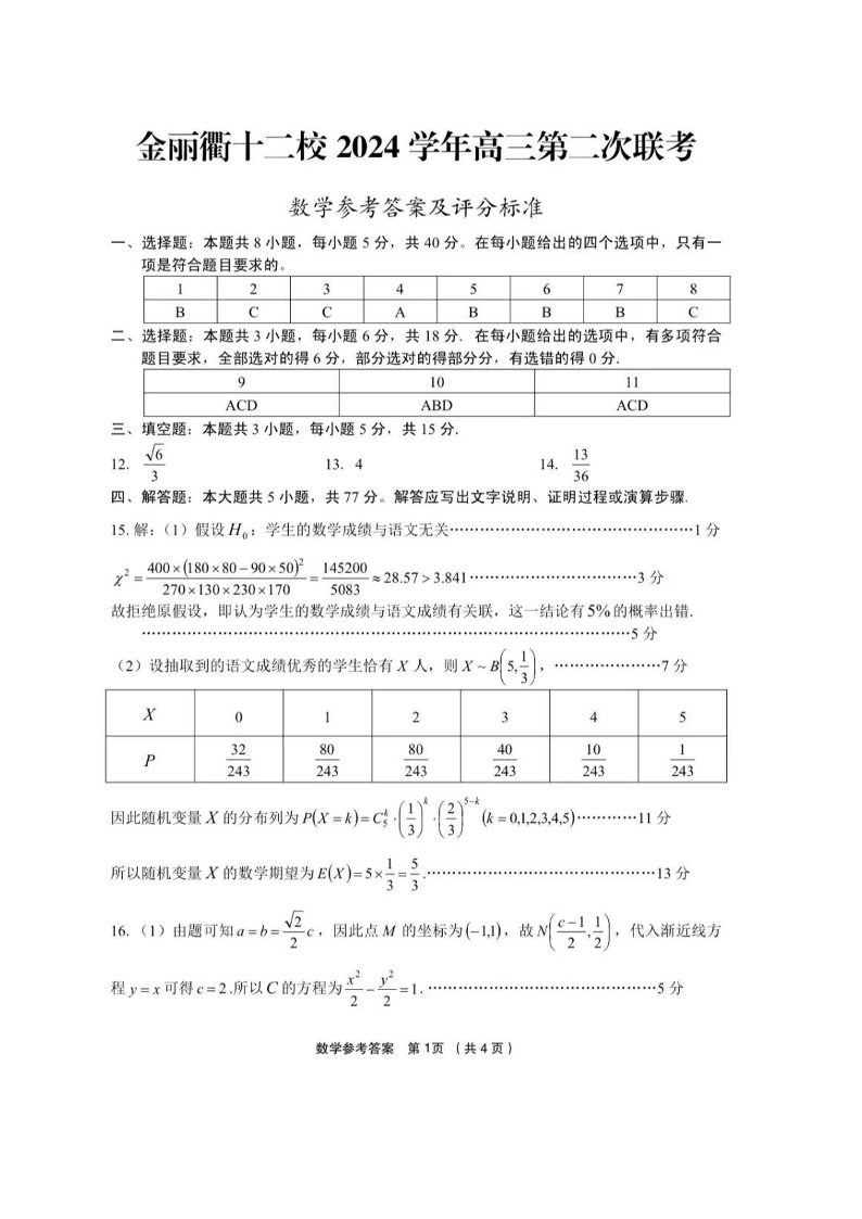 浙江省金丽衢十二校2024-2025学年下学期3月高三联考数学答案