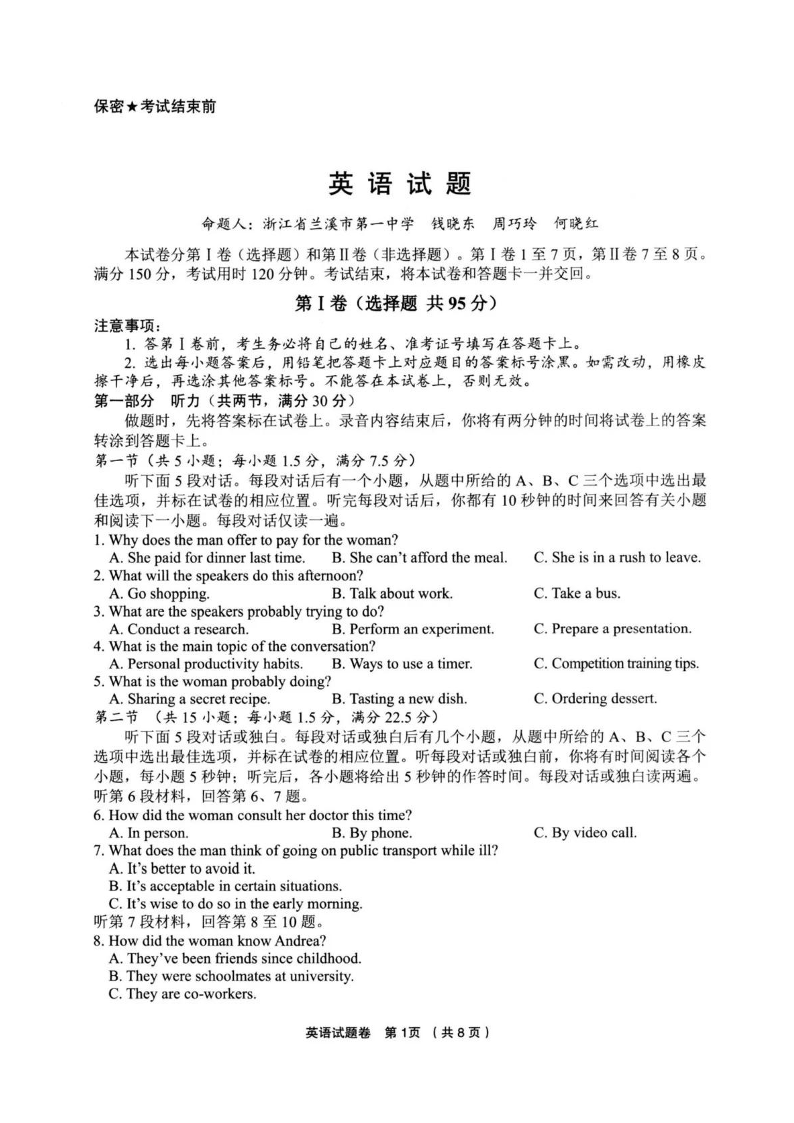 浙江省金丽衢十二校2024-2025学年下学期3月高三联考英语