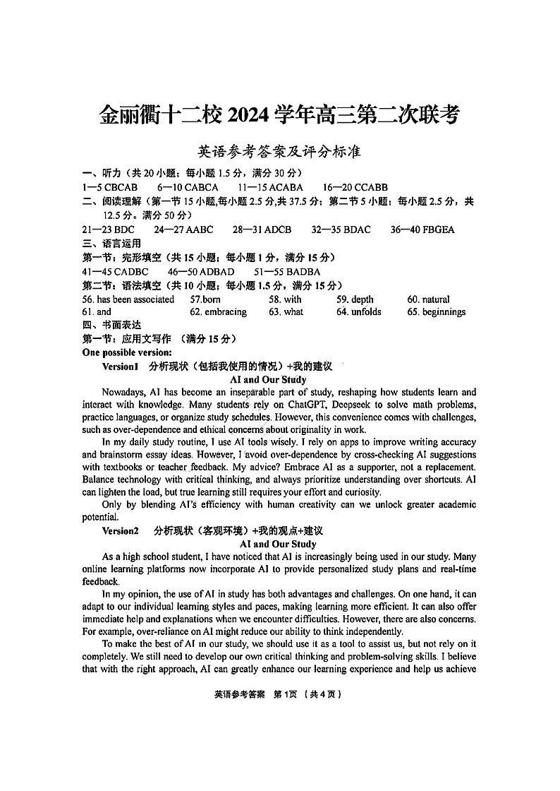 浙江省金丽衢十二校2024-2025学年下学期3月高三联考英语答案
