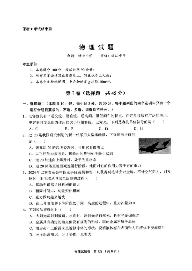 浙江省金丽衢十二校2024-2025学年下学期3月高三联考物理