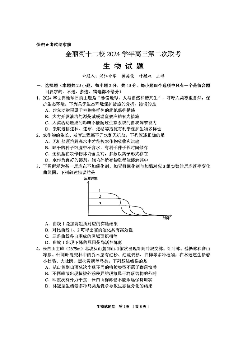 浙江省金丽衢十二校2024-2025学年下学期3月高三联考生物