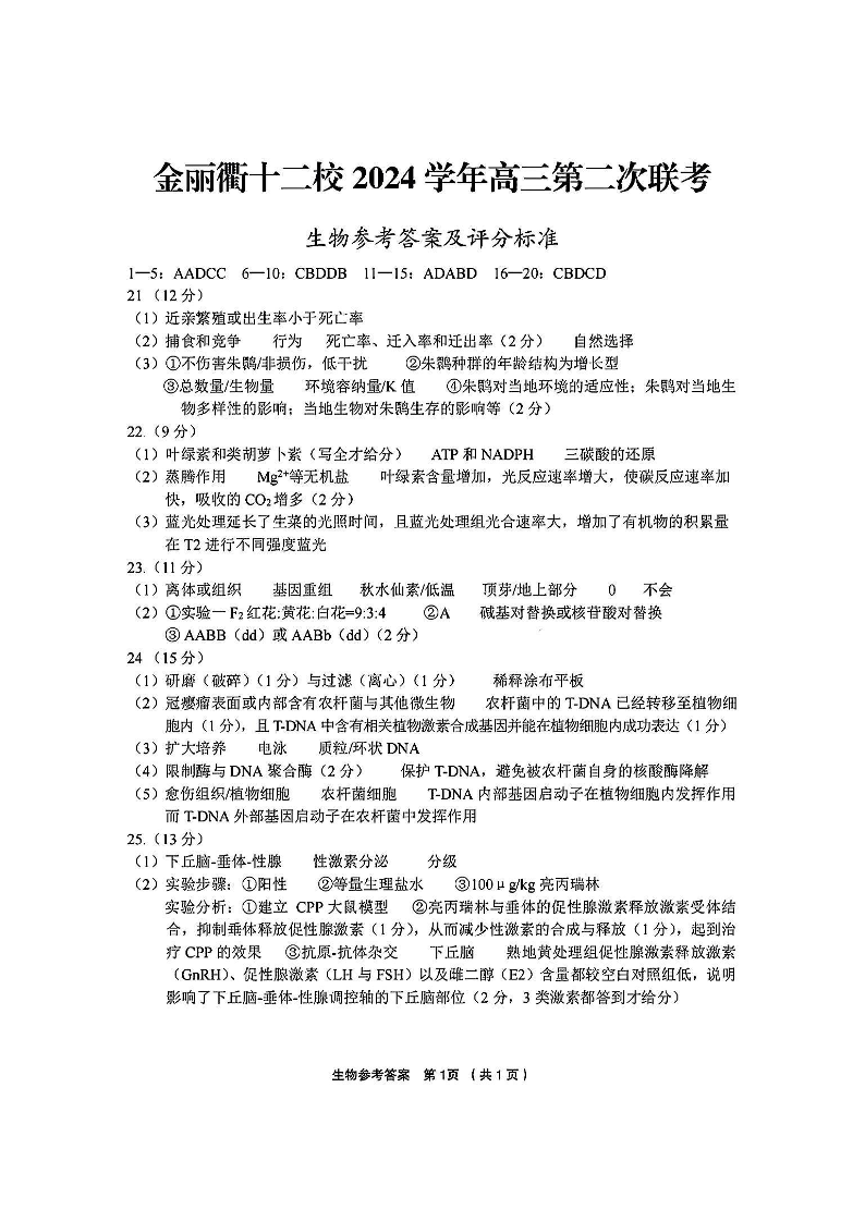 浙江省金丽衢十二校2024-2025学年下学期3月高三联考生物答案
