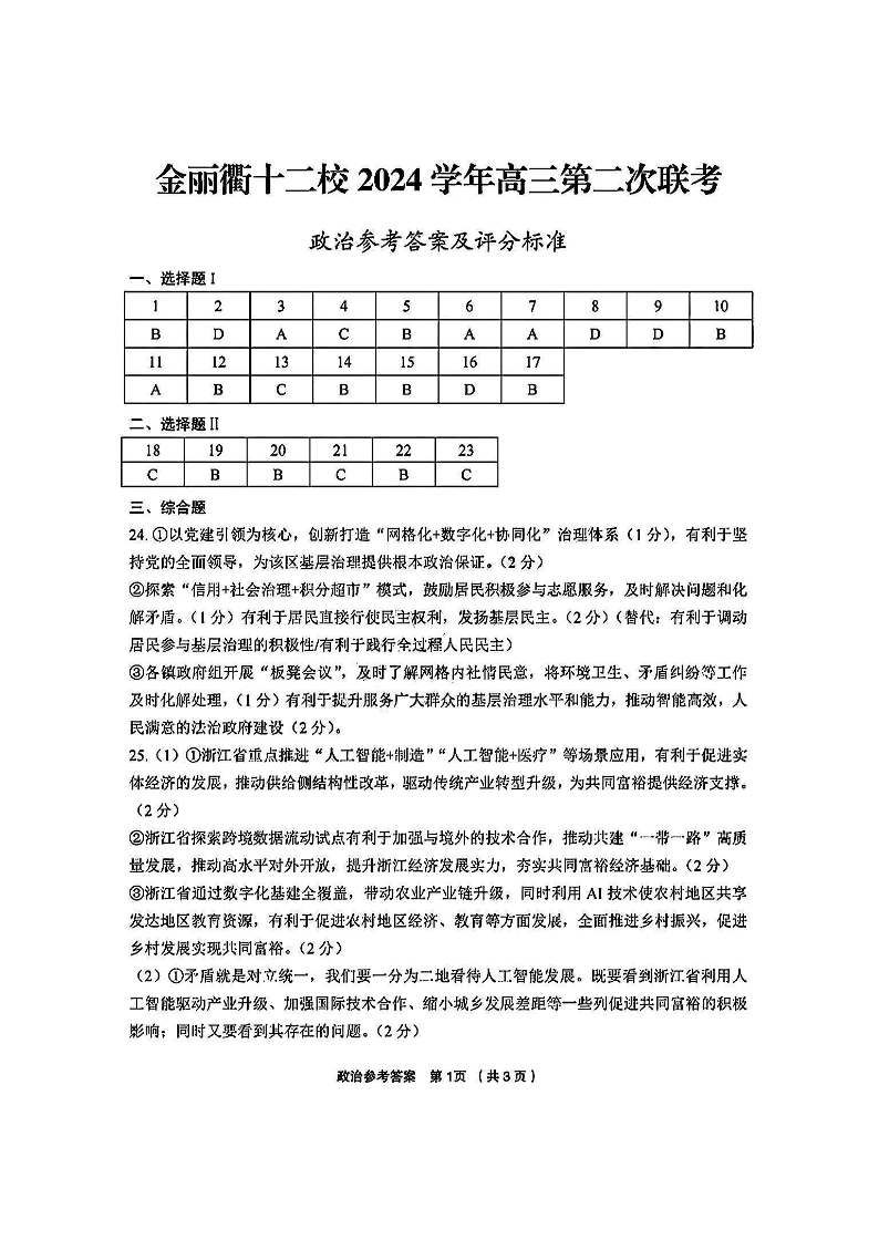 浙江省金丽衢十二校2024-2025学年下学期3月高三联考政治答案
