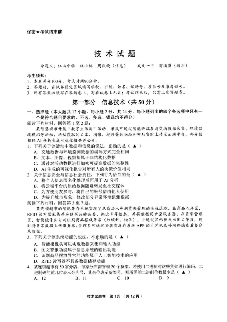 浙江省金丽衢十二校2024-2025学年下学期3月高三联考技术