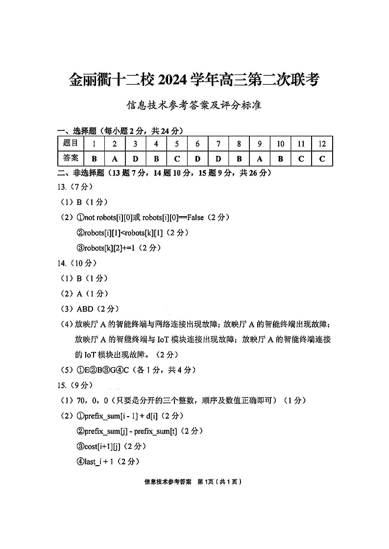浙江省金丽衢十二校2024-2025学年下学期3月高三联考技术答案