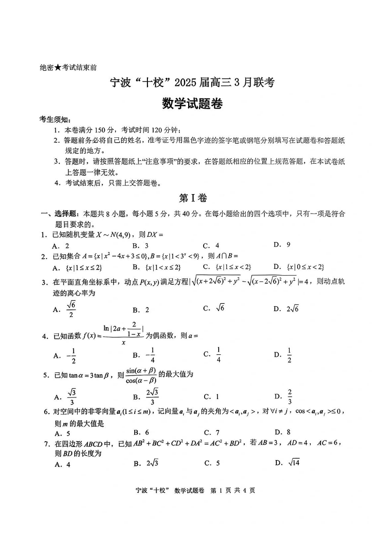 浙江省宁波市“十校”2024-2025学年下学期3月高三联考数学