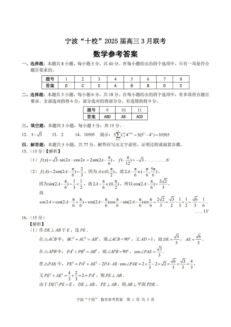 浙江省宁波市“十校”2024-2025学年下学期3月高三联考数学答案