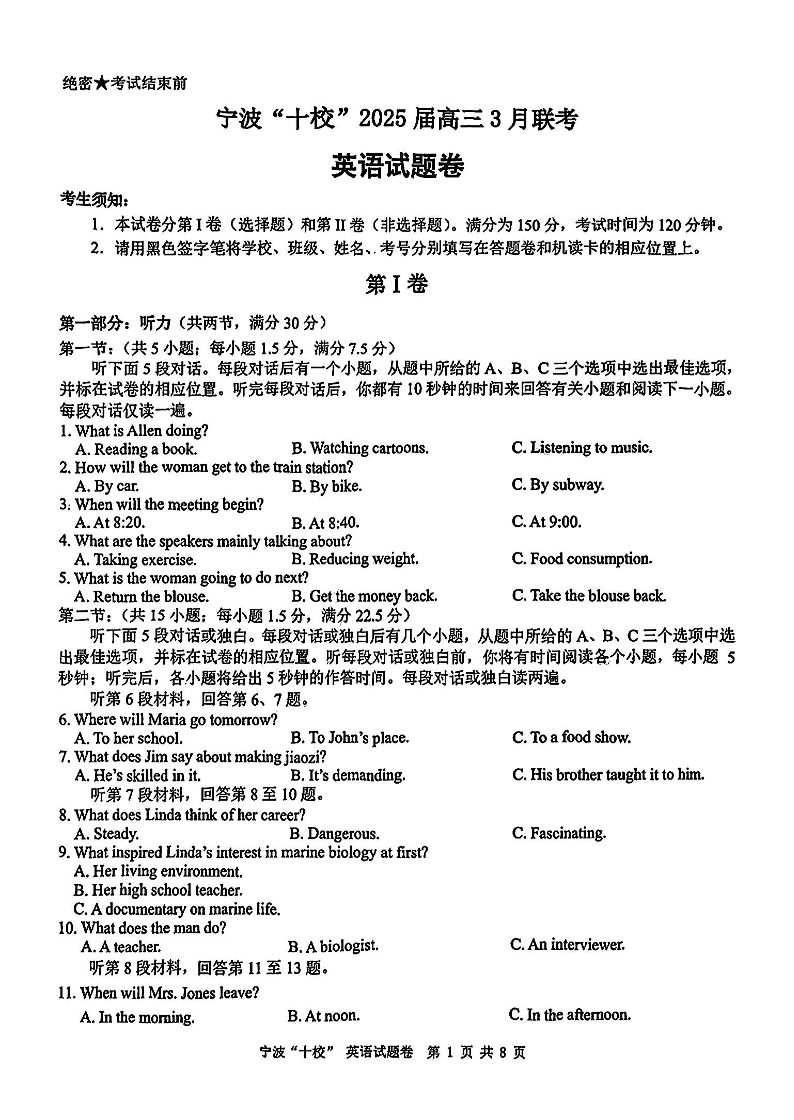 浙江省宁波市“十校”2024-2025学年下学期3月高三联考英语
