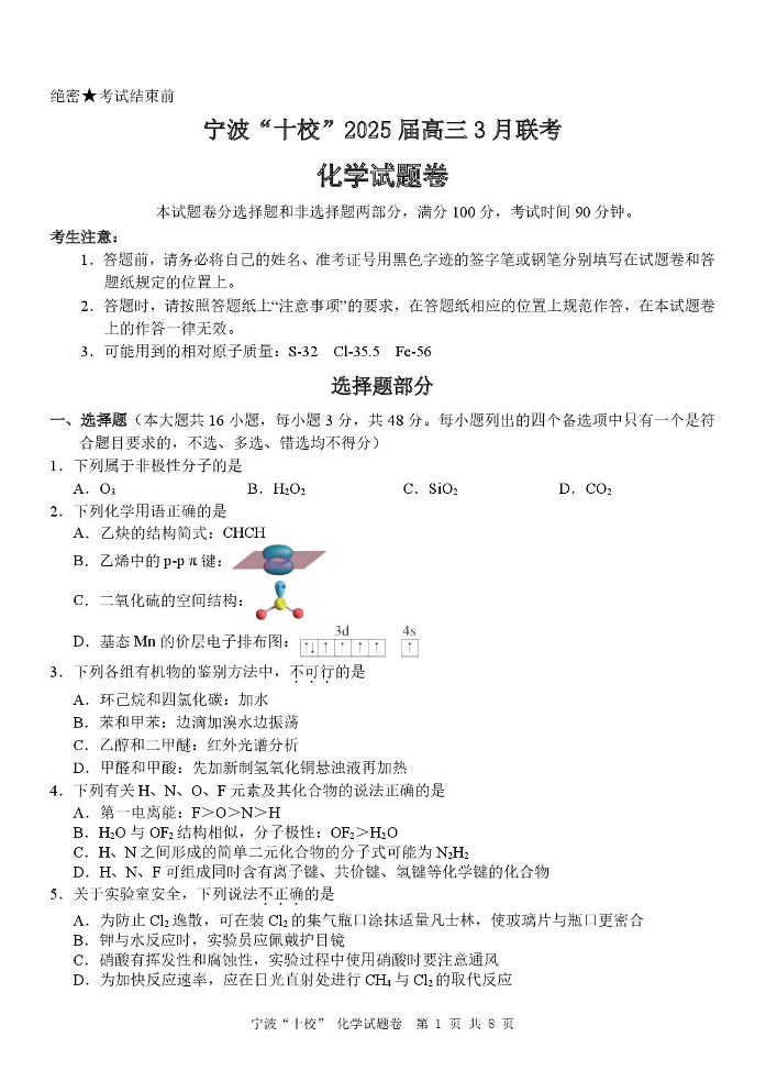 浙江省宁波市“十校”2024-2025学年下学期3月高三联考化学