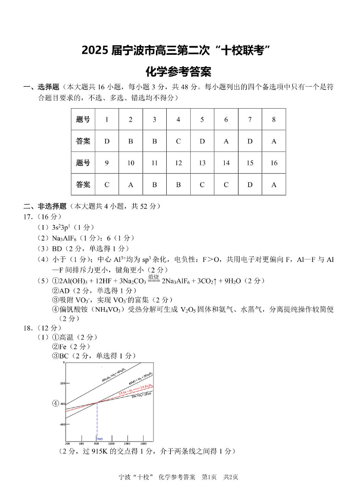 浙江省宁波市“十校”2024-2025学年下学期3月高三联考化学答案