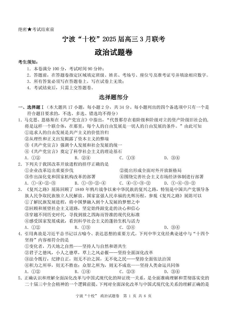 浙江省宁波市“十校”2024-2025学年下学期3月高三联考政治+答案