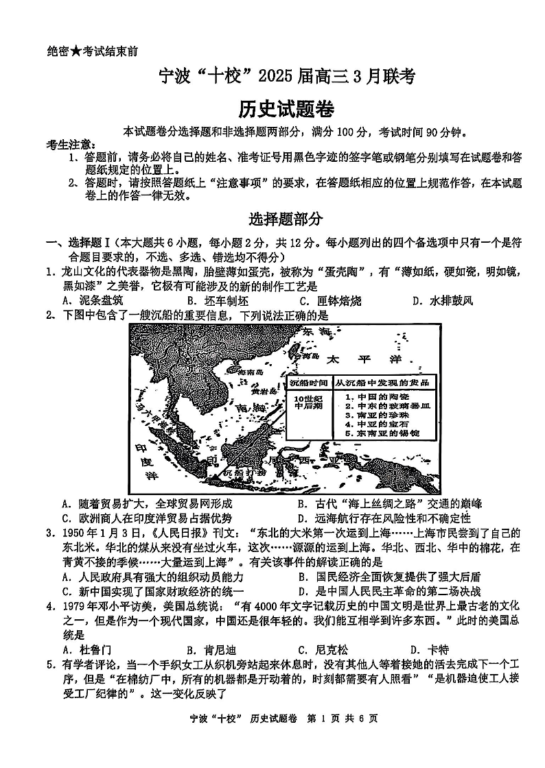 浙江省宁波市“十校”2024-2025学年下学期3月高三联考历史