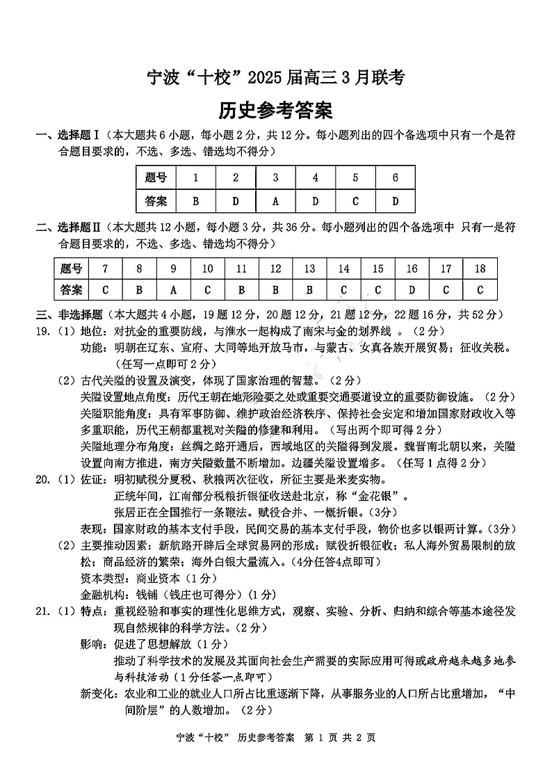 浙江省宁波市“十校”2024-2025学年下学期3月高三联考历史答案