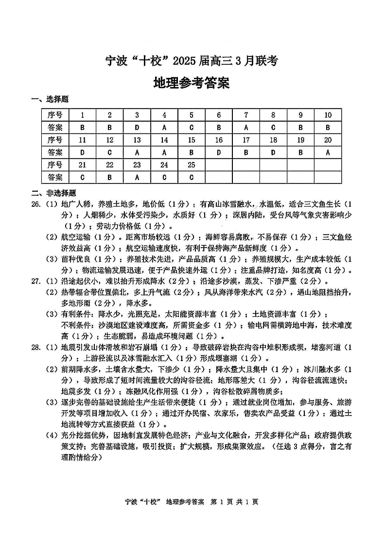 浙江省宁波市“十校”2024-2025学年下学期3月高三联考地理答案