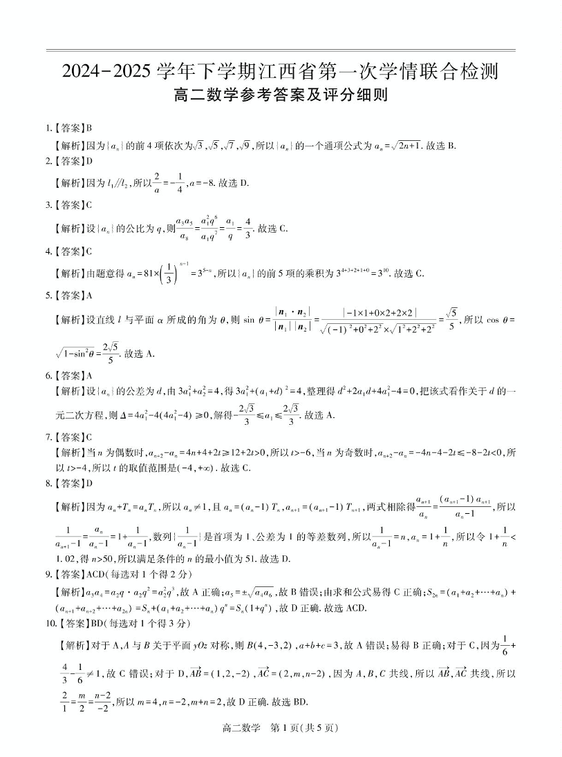 江西省上进联考2024-2025学年下学期3月高二学情联合检测数学答案