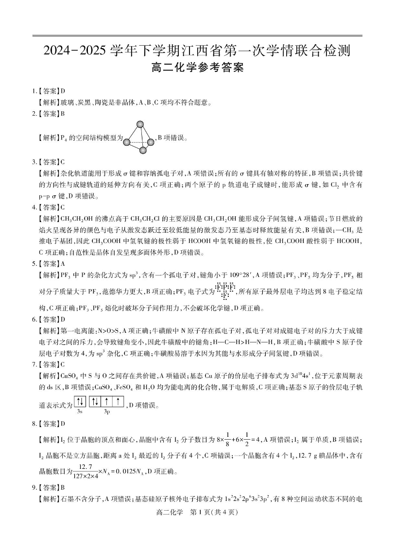 江西省上进联考2024-2025学年下学期3月高二学情联合检测化学答案
