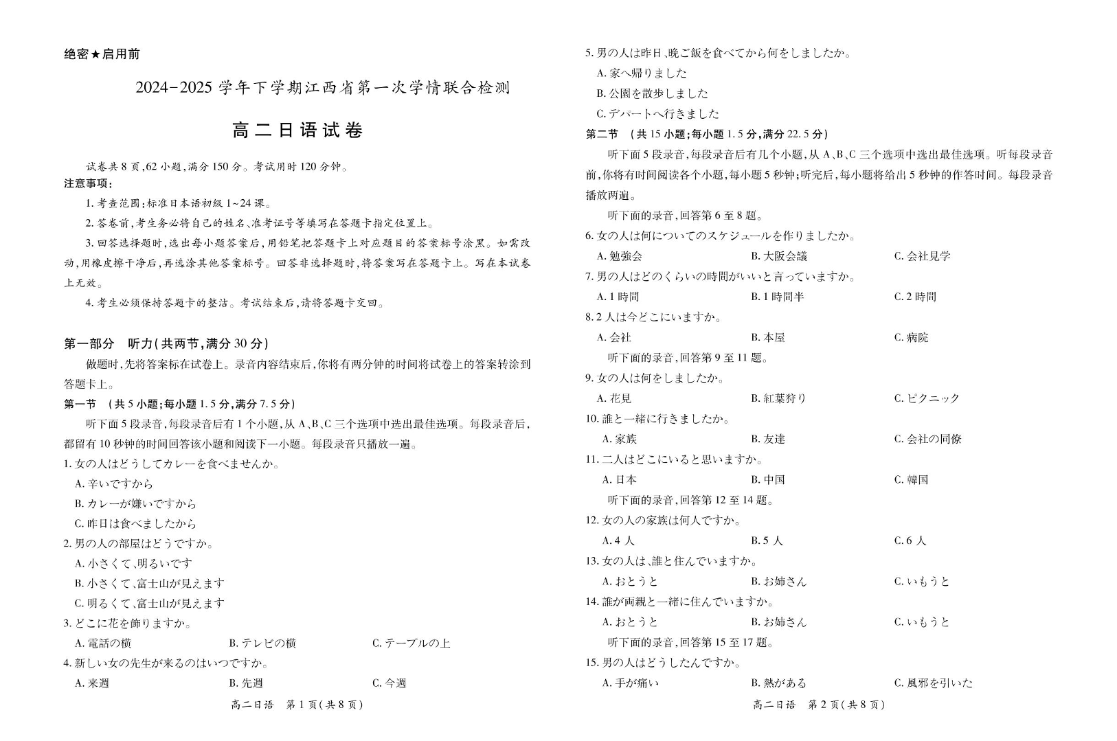 江西省上进联考2024-2025学年下学期3月高二学情联合检测日语