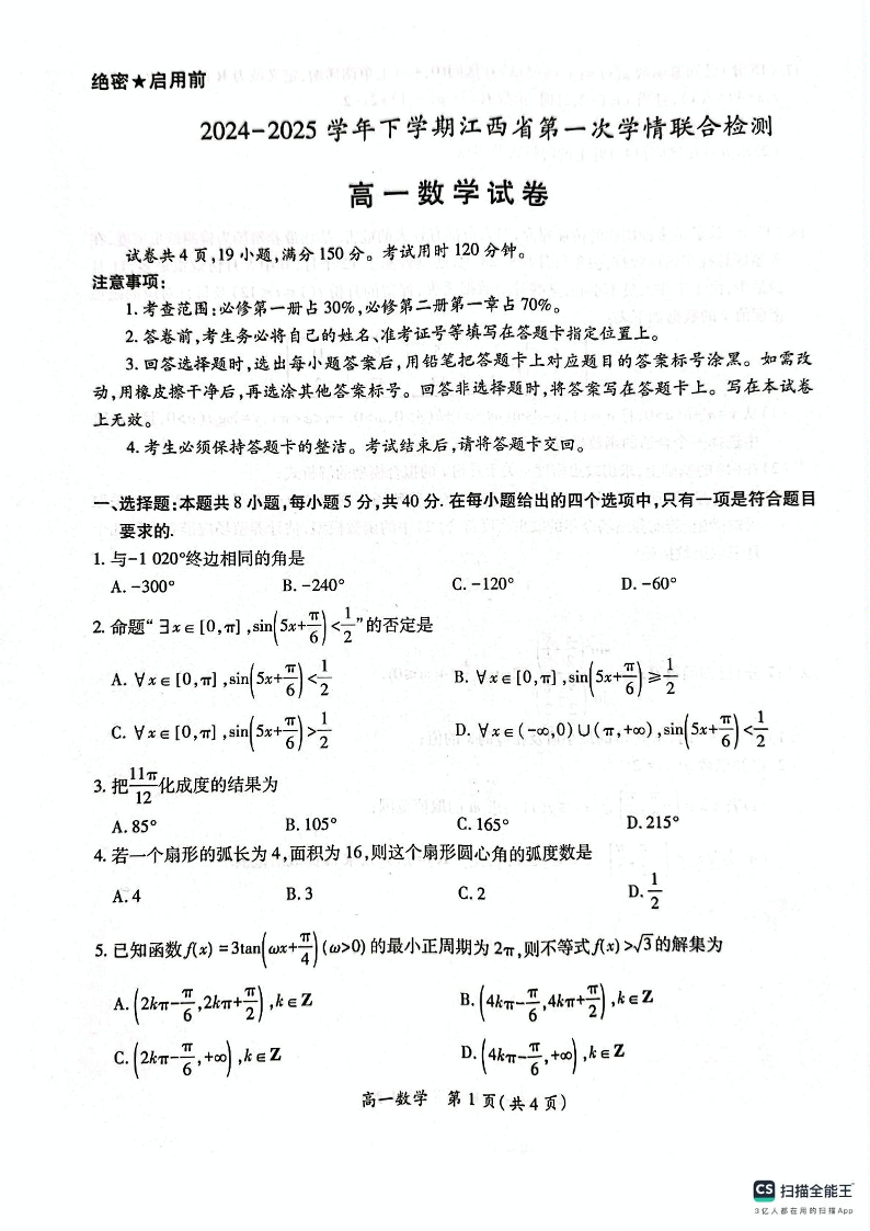 江西省上进联考2024-2025学年下学期3月高一第一次学情检测数学