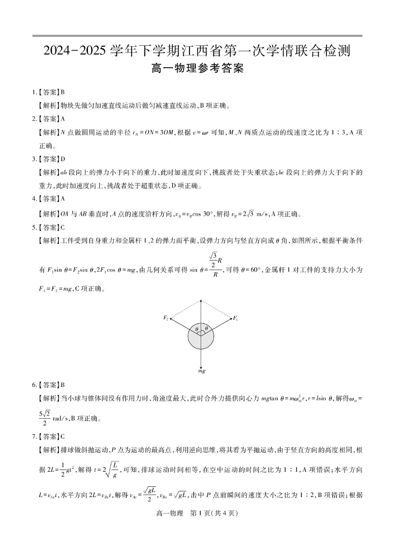 江西省上进联考2024-2025学年下学期3月高一第一次学情检测物理答案