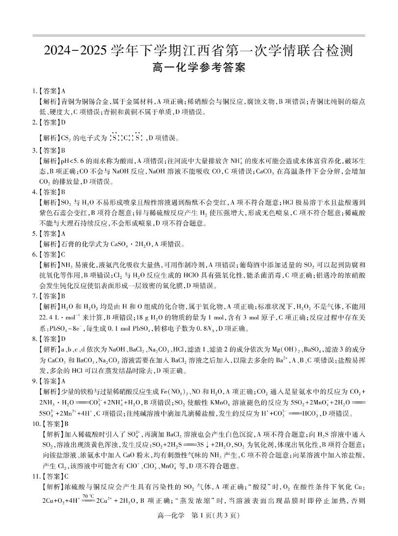 江西省上进联考2024-2025学年下学期3月高一第一次学情检测化学答案