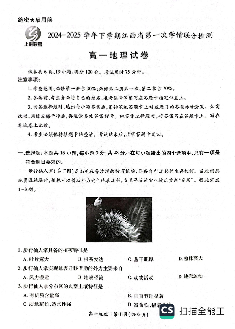 江西省上进联考2024-2025学年下学期3月高一第一次学情检测地理+答案