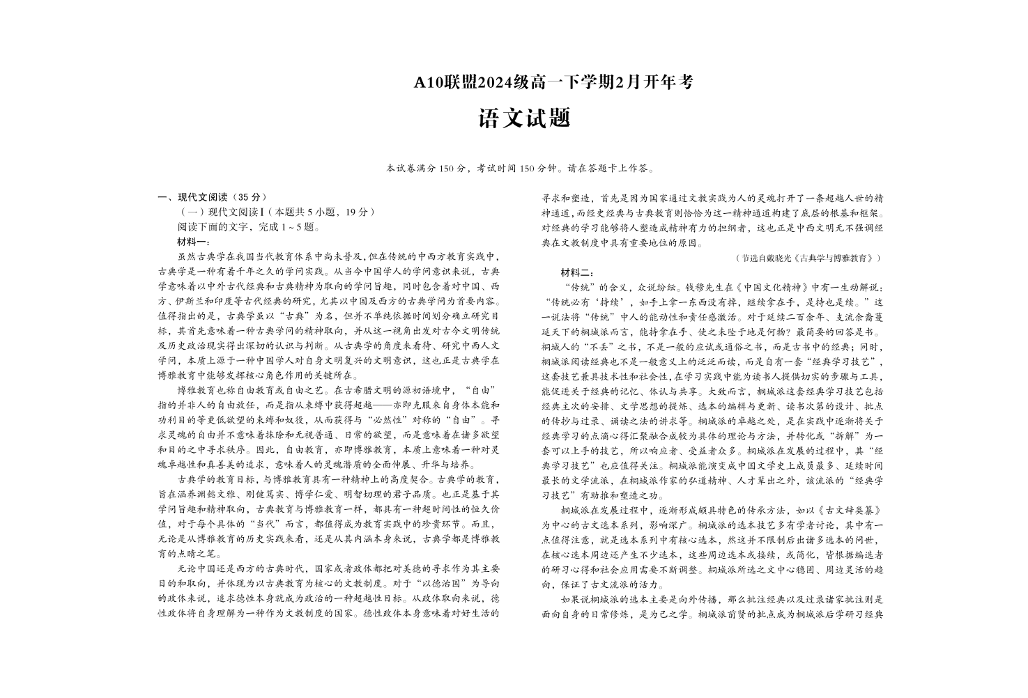安徽省A10联盟2024-2025学年下学期2月高一开年考试语文+答案