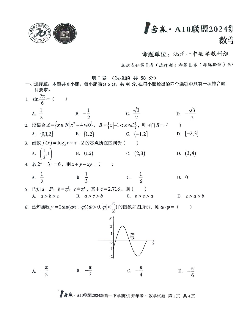 安徽省A10联盟2024-2025学年下学期2月高一开年考试数学
