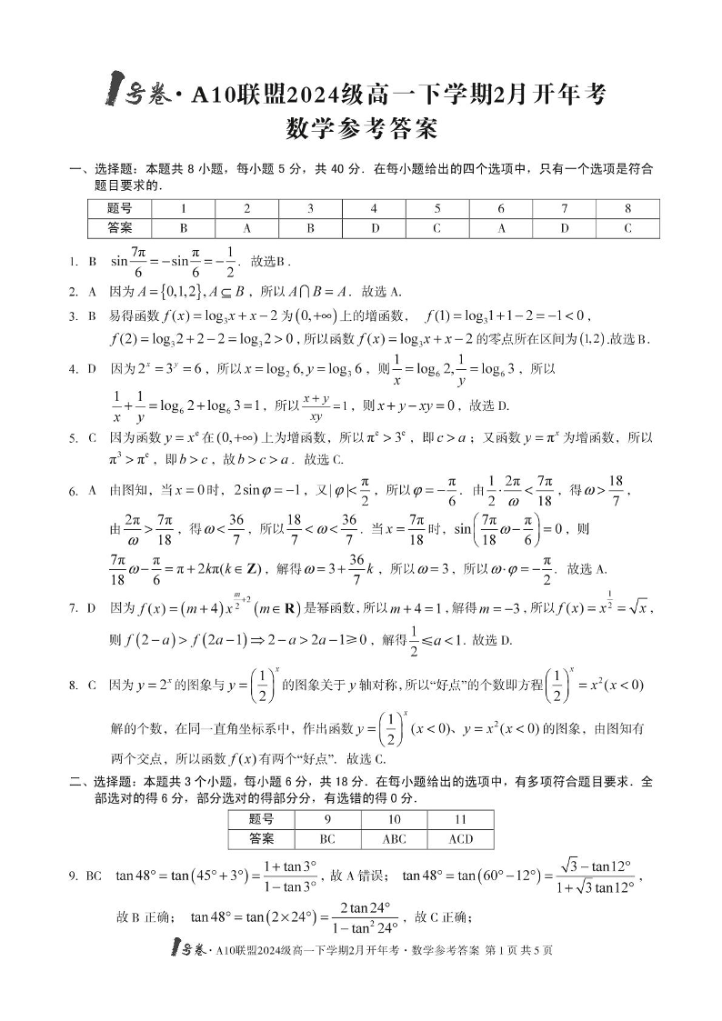 安徽省A10联盟2024-2025学年下学期2月高一开年考试数学答案