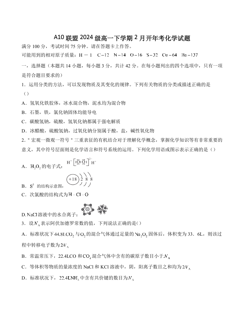 安徽省A10联盟2024-2025学年下学期2月高一开年考试化学+答案