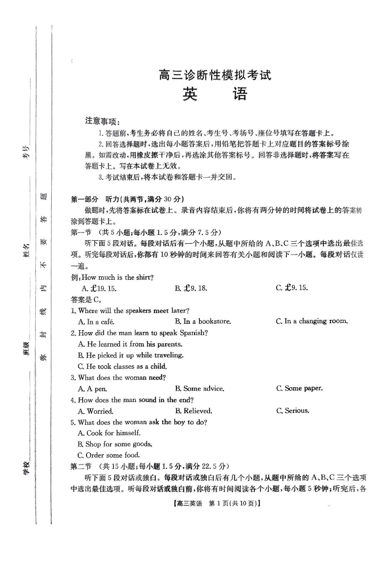 河北省区域高中2024-202学年下学期3月高三诊断性模拟联考英语+答案