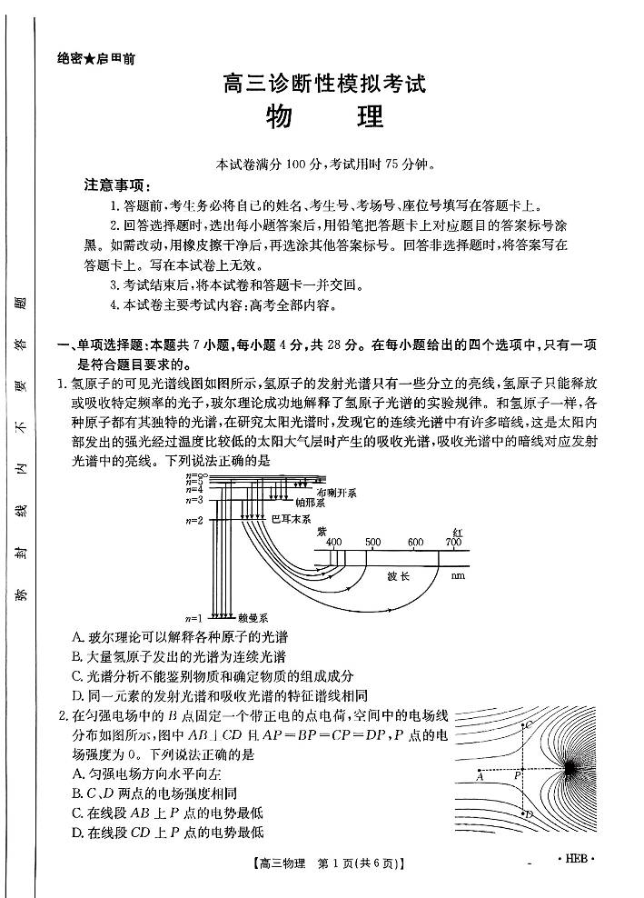 河北省区域高中2024-202学年下学期3月高三诊断性模拟联考物理+答案