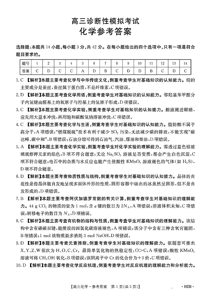 河北省区域高中2024-202学年下学期3月高三诊断性模拟联考化学答案