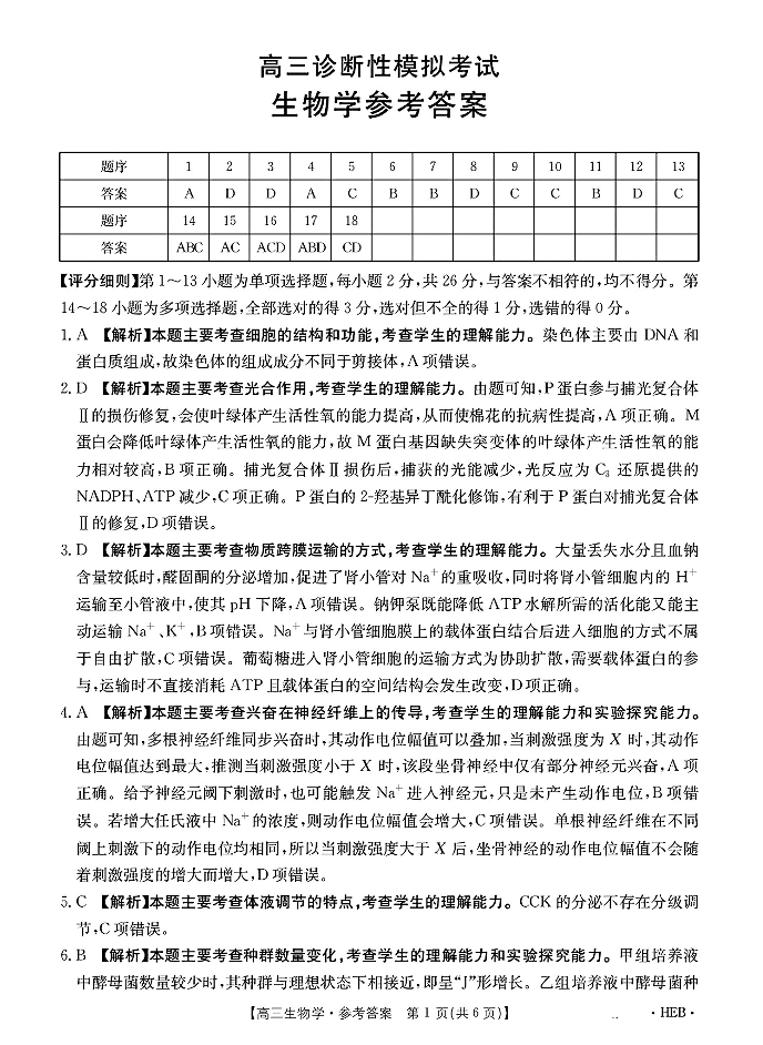 河北省区域高中2024-202学年下学期3月高三诊断性模拟联考生物答案