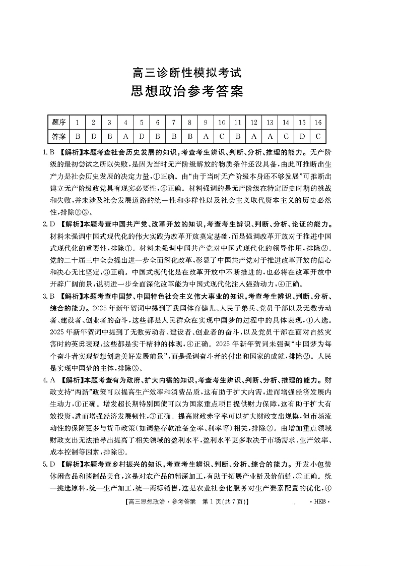 河北省区域高中2024-202学年下学期3月高三诊断性模拟联考政治答案