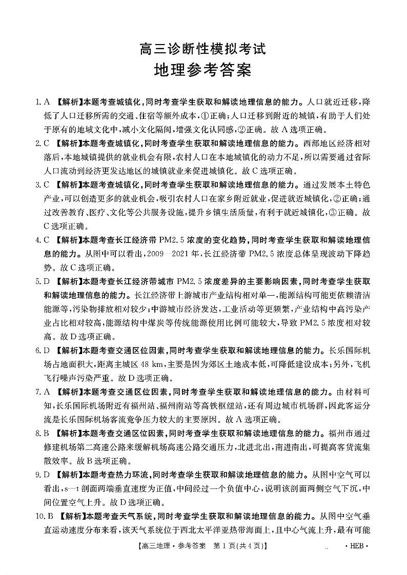 河北省区域高中2024-202学年下学期3月高三诊断性模拟联考地理答案