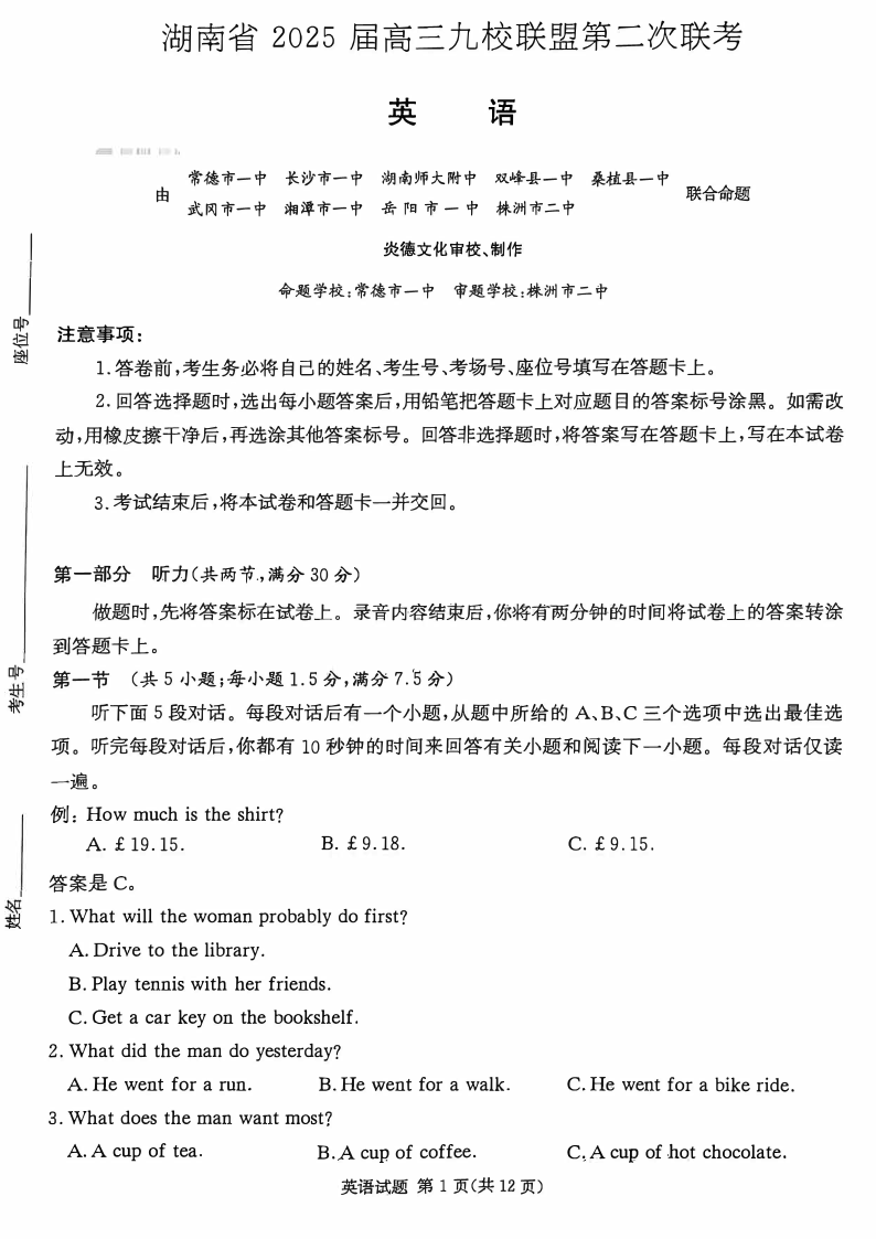 湖南省湘东九校2024-2025学年下学期高三第二次联考英语