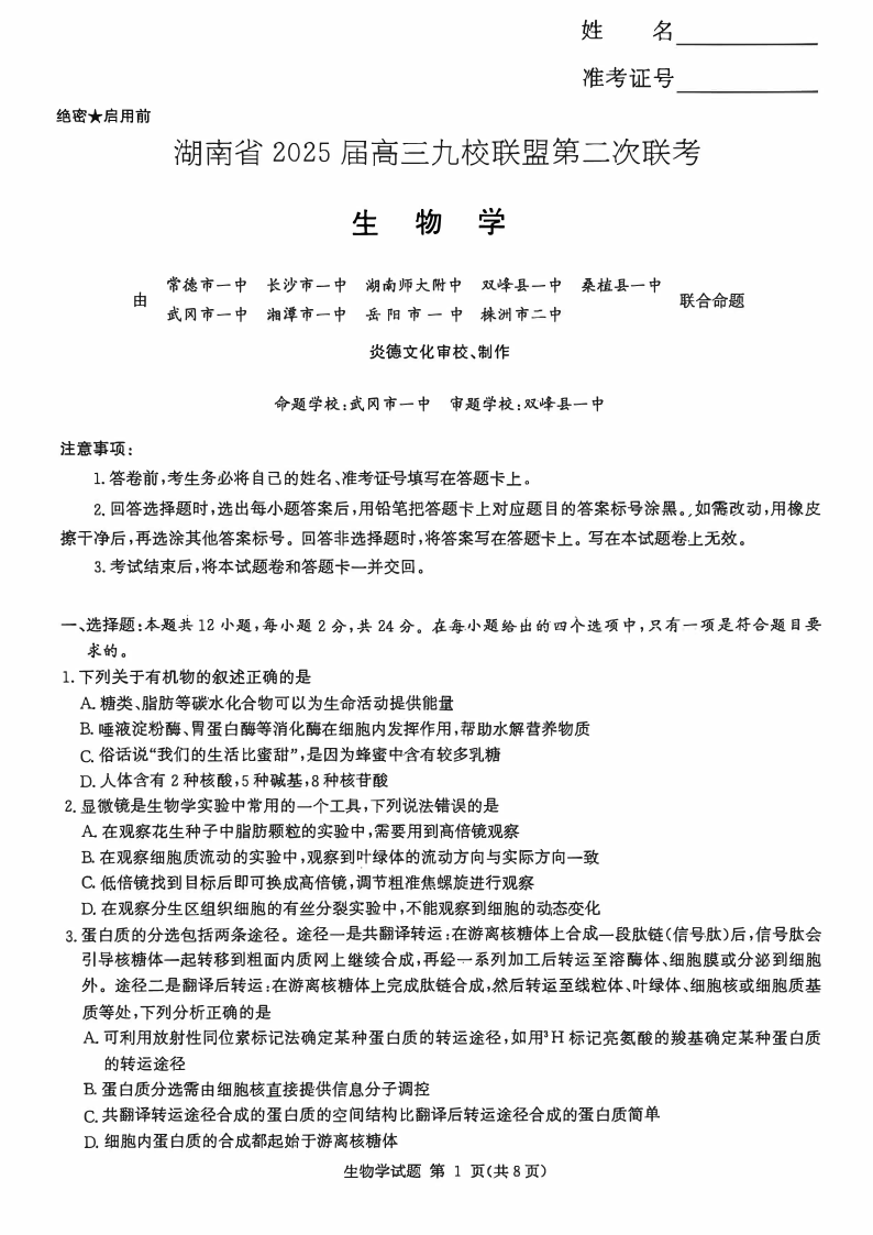 湖南省湘东九校2024-2025学年下学期高三第二次联考生物