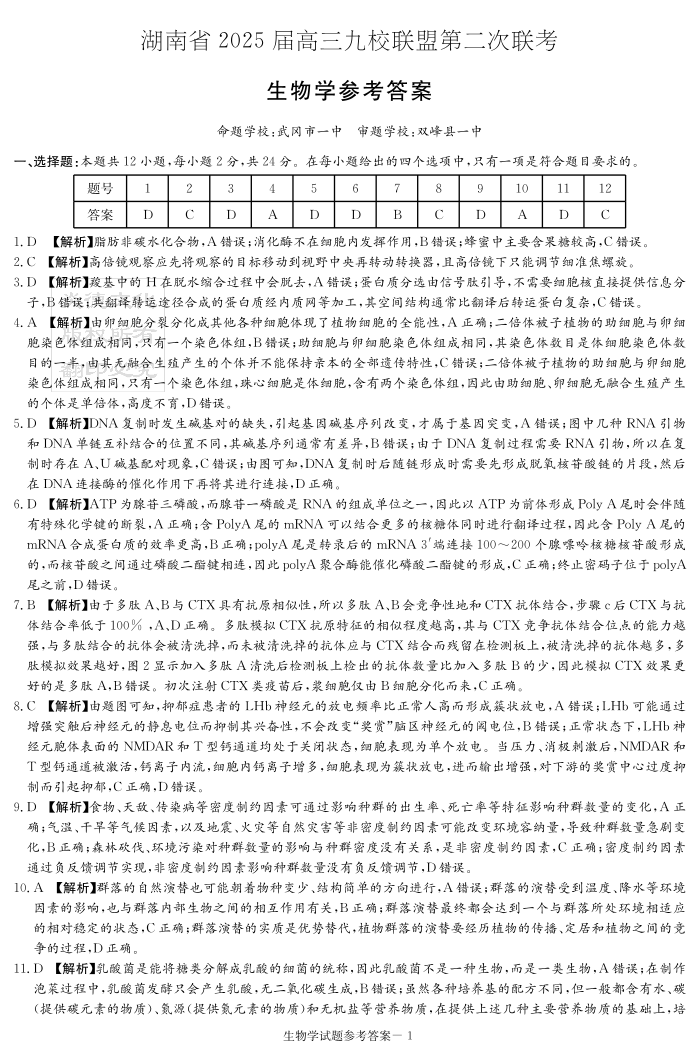 湖南省湘东九校2024-2025学年下学期高三第二次联考生物答案