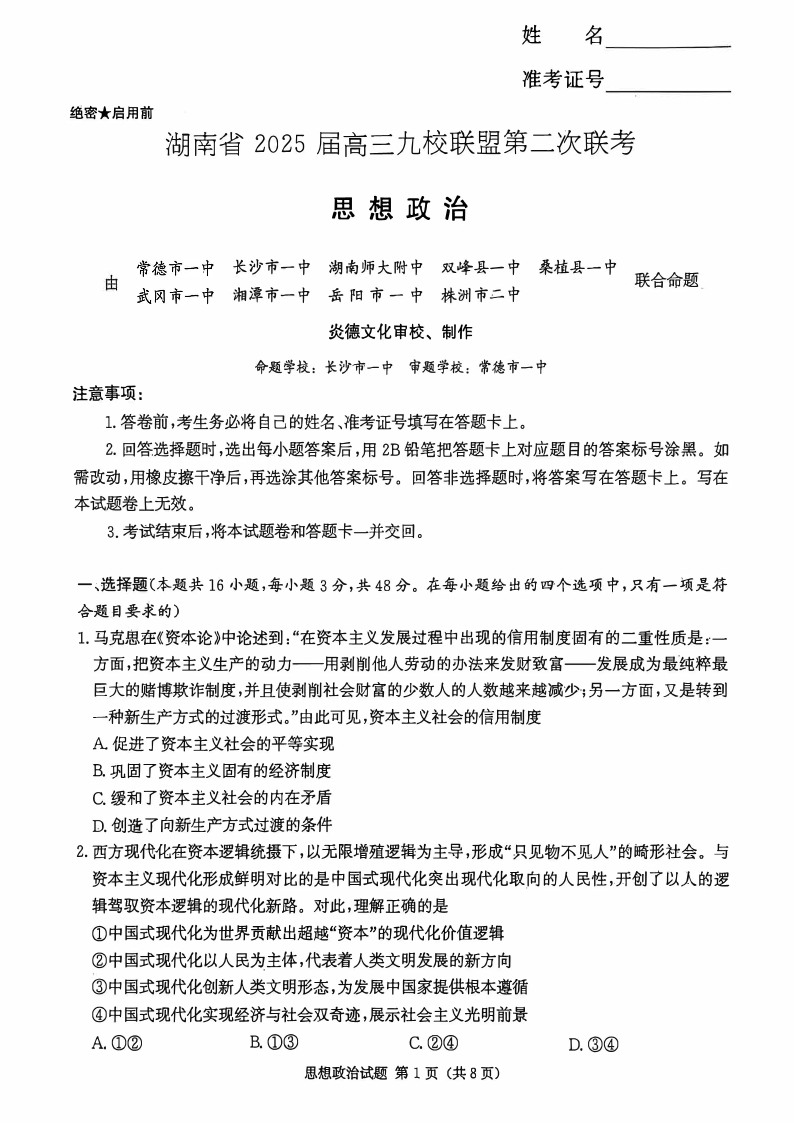 湖南省湘东九校2024-2025学年下学期高三第二次联考政治