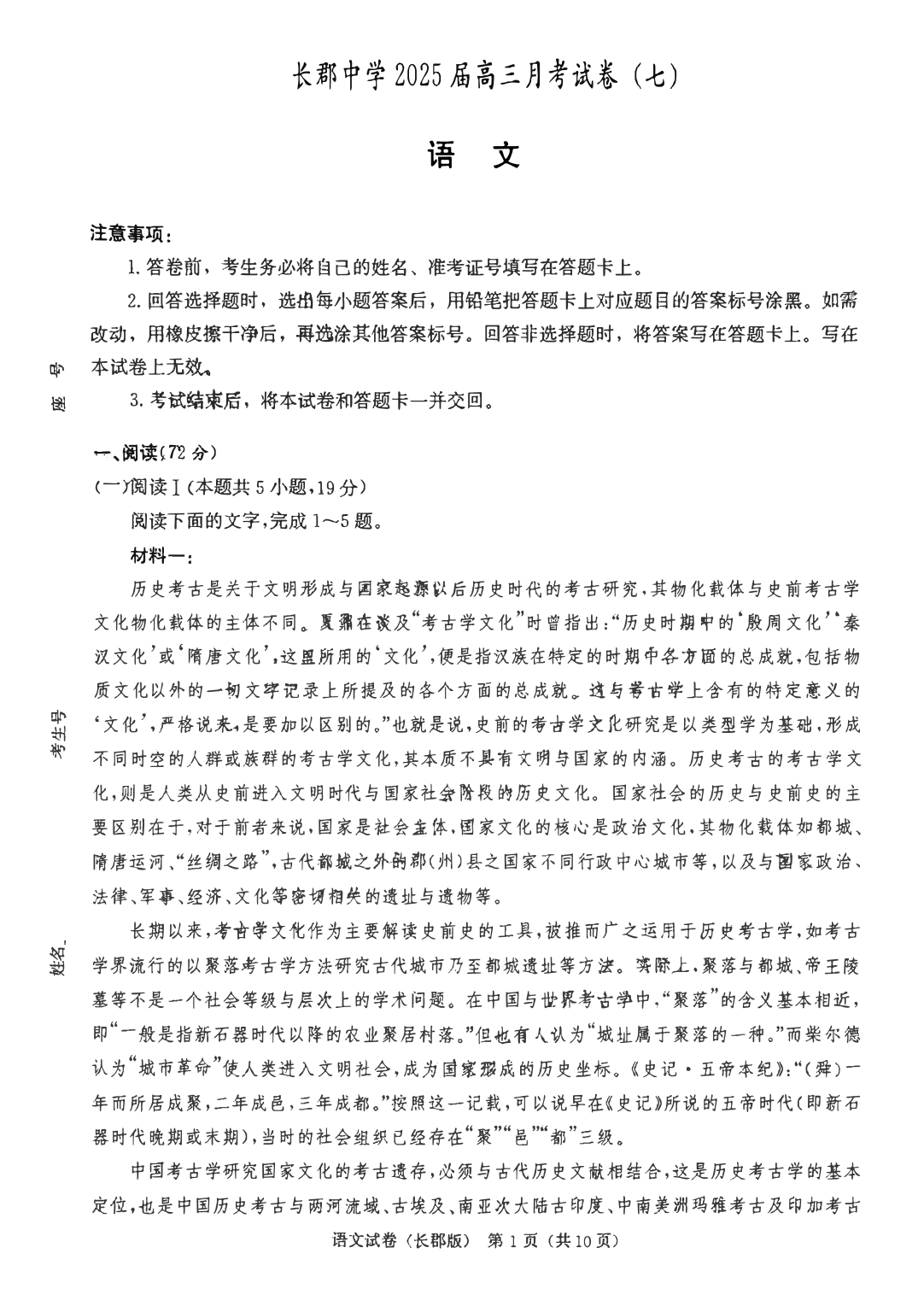 湖南省长沙市长郡中学2024- 2025 学年下学期高三月考(七)语文+答案