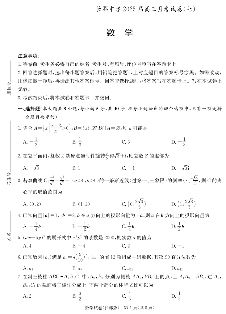 湖南省长沙市长郡中学2024- 2025 学年下学期高三月考(七)数学